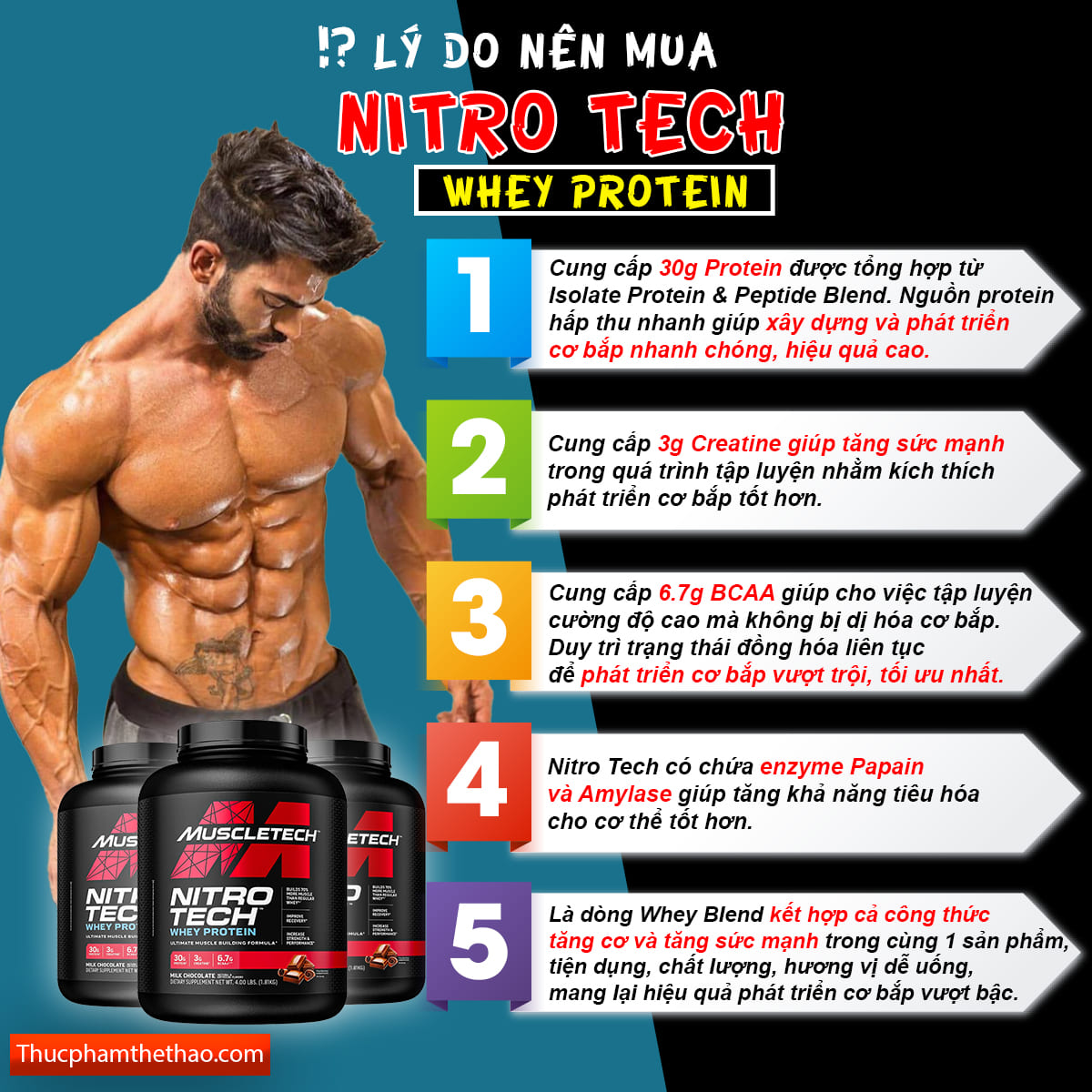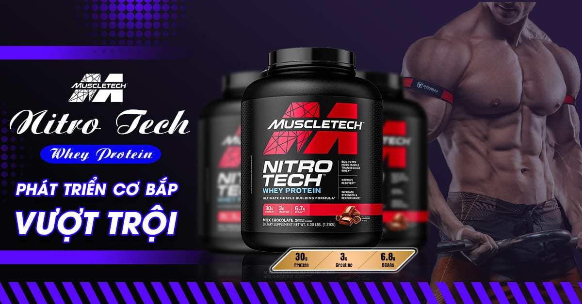 NITRO-TECH® là một công thức khoa học được thiết kế và tăng cường phát triển Whey Protein cho tất cả các vận động viên đang muốn sở hữu cơ bắp khủng, sức mạnh và hiệu suất tập luyện tốt hơn. NITRO-TECH® chứa protein có nguồn gốc chủ yếu từ whey protein peptide và thêm các thành phần phụ là whey isolate, Concentrate – là các nguồn protein sạch và tinh khiết . NITRO-TECH® cũng được tăng cường với lượng creatine, cung cấp cho cơ bắp để phát triển vượt trội và mang lại sức mạnh giúp tập luyện tốt hơn.